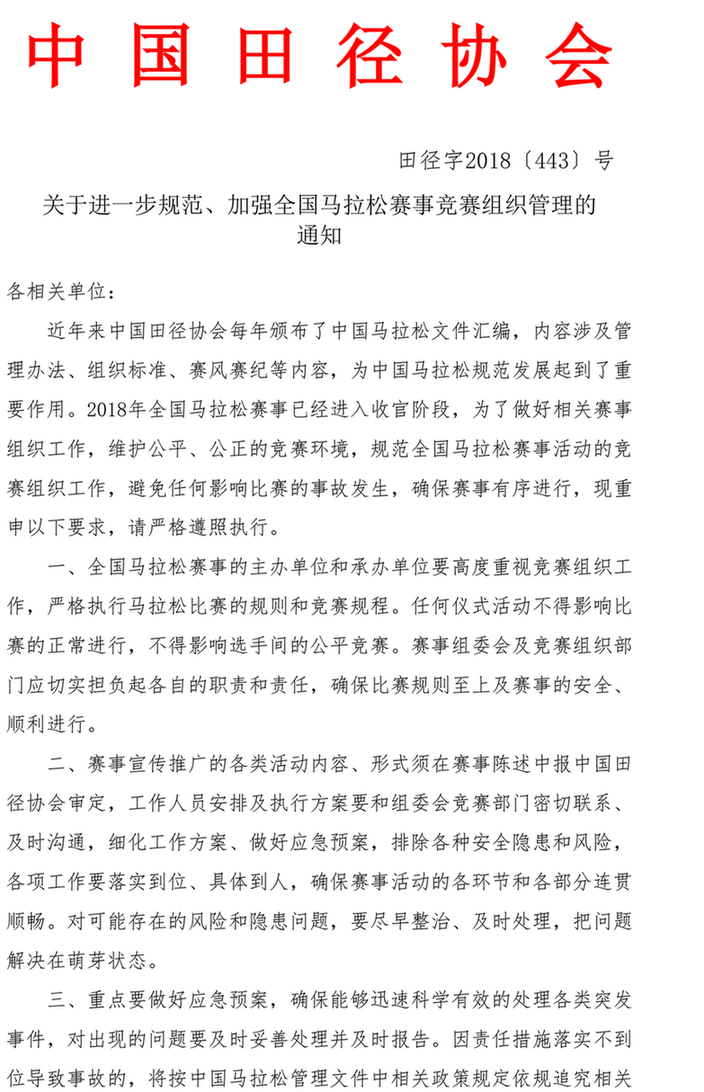 在这份名为《关于进一步规范、加强全国马拉松赛事竞赛组织管理的通知》里,中国田径协会指出,2018年全国马拉松赛事已进入收官阶段,为维护公平、公正的竞赛环境,规范全国马拉松赛事活动的竞赛组织工作,避免任何影响比赛的事故发生,确保赛事有序进行,要求各相关单位严格遵照协会每年颁布的中国马拉松文件汇编的各项要求,严格执行马拉松比赛的规则和竞赛规程。任何仪式活动不得影响比赛的正常进行,不得影响选手间的公平竞赛。
