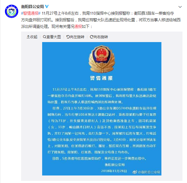 澎湃新闻(www.thepaper.cn)注意到,衡阳县公安局官方微博在11月28日下午发布的有关该起事件的微博中表示,事发后,有群众报警时曾提到“一乘客抢夺司机方向盘并欧打司机”。但“抢夺方向盘”一事,在该局的通报中并未提及。