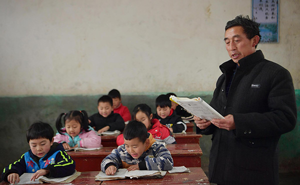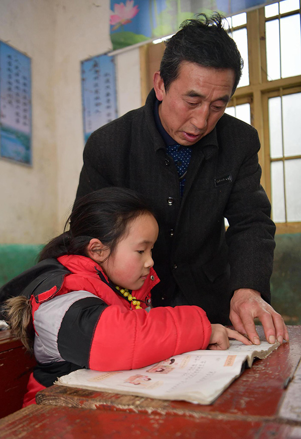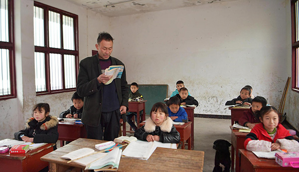 2018年12月4日,湖北恩施,周美成老师在朝南教学点教一年级学生朗读课文。