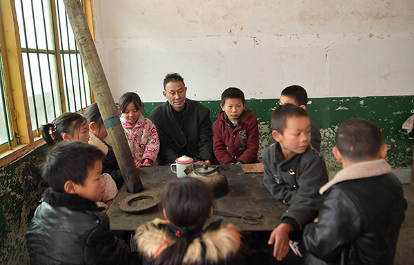2018年12月4日,湖北恩施,周文田老师和太坪龙教学点孩子合影。
