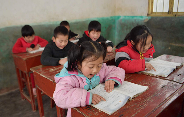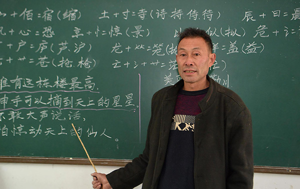2018年12月4日,湖北恩施,周美成老师在朝南教学点教一年级学生朗读课文。