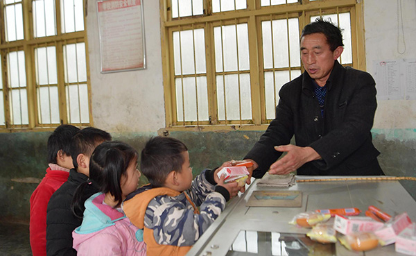 2018年12月4日,湖北恩施,周美成老师在朝南教学点为学生发放营养午餐。