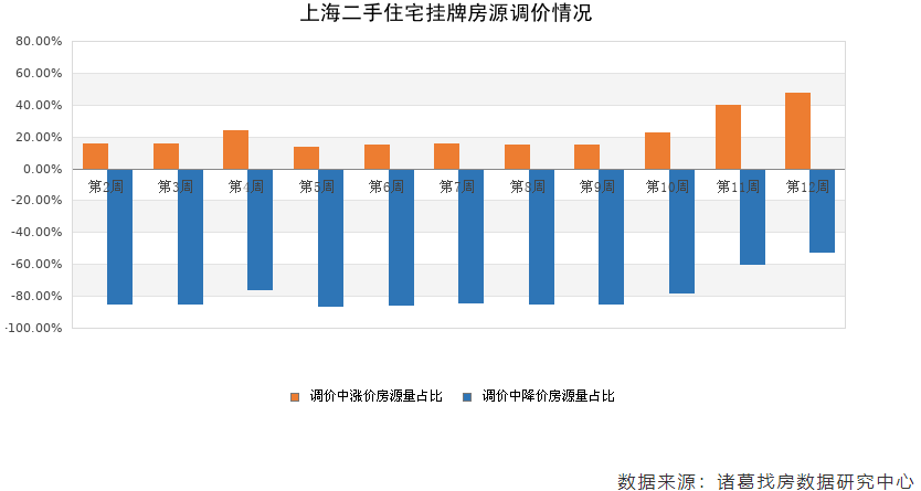 诸葛找房披露的最新一周的数据显示,上海目前挂牌的二手房房源中,其中调价房源有近60%在降价。