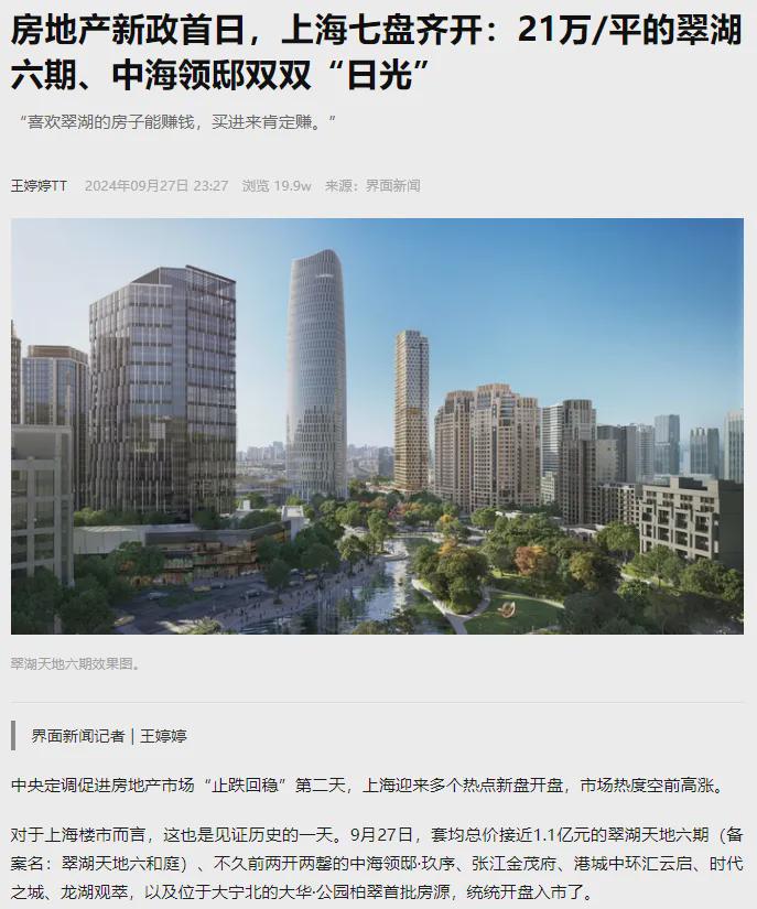 去年上半年,位于上海黄浦区核心地段的中海·顺昌玖里,一天卖出了512套房源中的505套,总销售额达196.53亿元,这个销售数字被创造了全国商品房有史以来单次开盘最高销售额纪录。