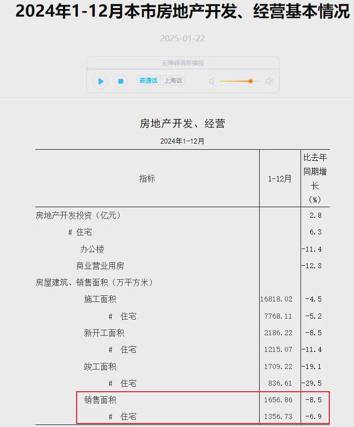 2024年上海商品房销售面积1656.86万平方米,下跌了8.5%,其中住宅成交了1356.73万平方米,下跌了6.9%。