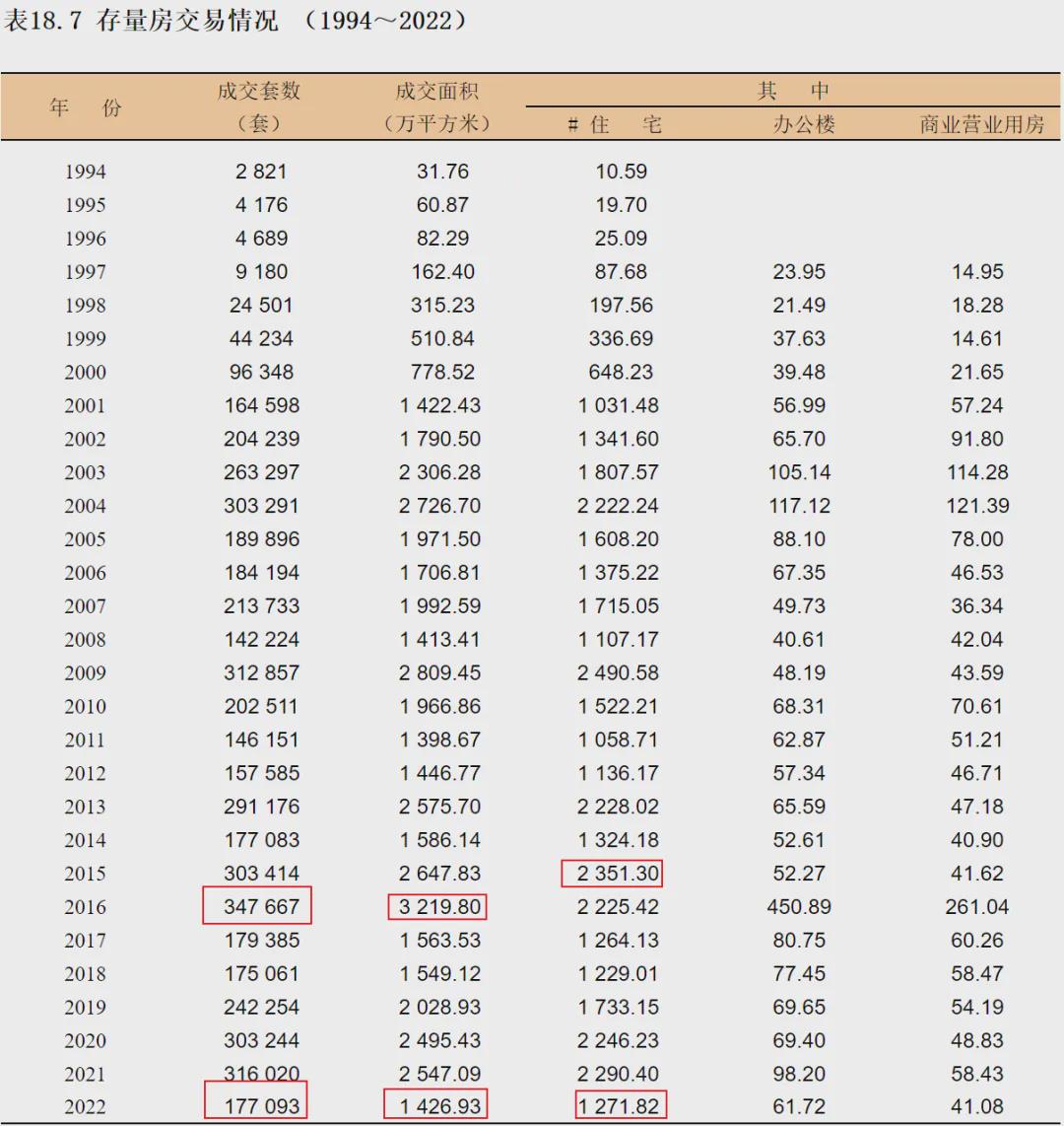 其中二手住宅成交面积从2015年高点的2351.3万平方米降至2022年的1271.82万平方米,下降了45.9%。