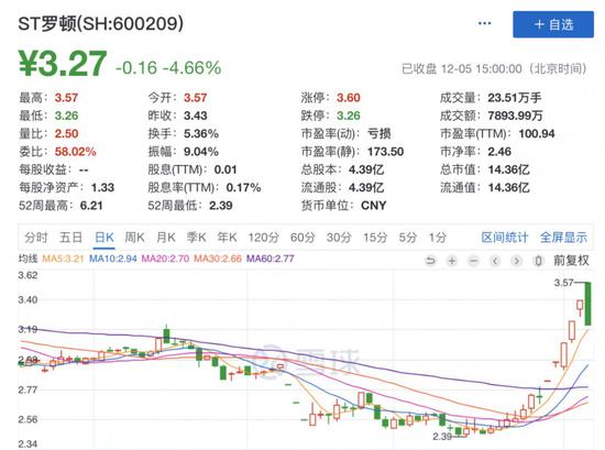 而此前连续录得5个涨停的ST罗顿今日同样大跌4.66%,截至收盘,报3.27元/股。