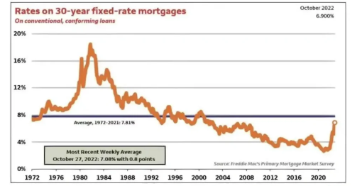 (美国比较特殊,过去几年大放水,资产价格猛涨,处于加息周期,房贷利率已经上涨至6+%,不过历史趋势是下降的)