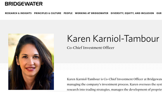 这一次伴随着重磅晋升——桥水基金第三任共同投资主管,Karniol-Tambour成为华尔街最有影响力的投资人之一。这在以男性为主导的华尔街尤为引人注目。