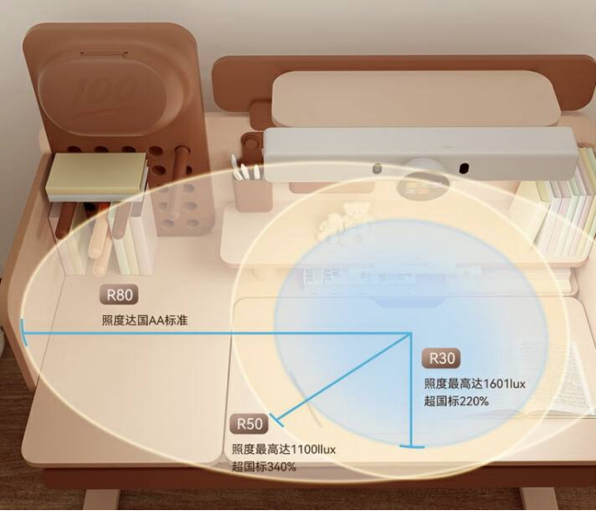 AI护眼光:最大照明可以覆盖全桌,用来保证使用过程中没有光线不均匀的问题;无蓝光、无频闪符合多项标准。同时智能开关可以保证入座开灯、离座关灯,并有AI疲劳提醒灯功能。