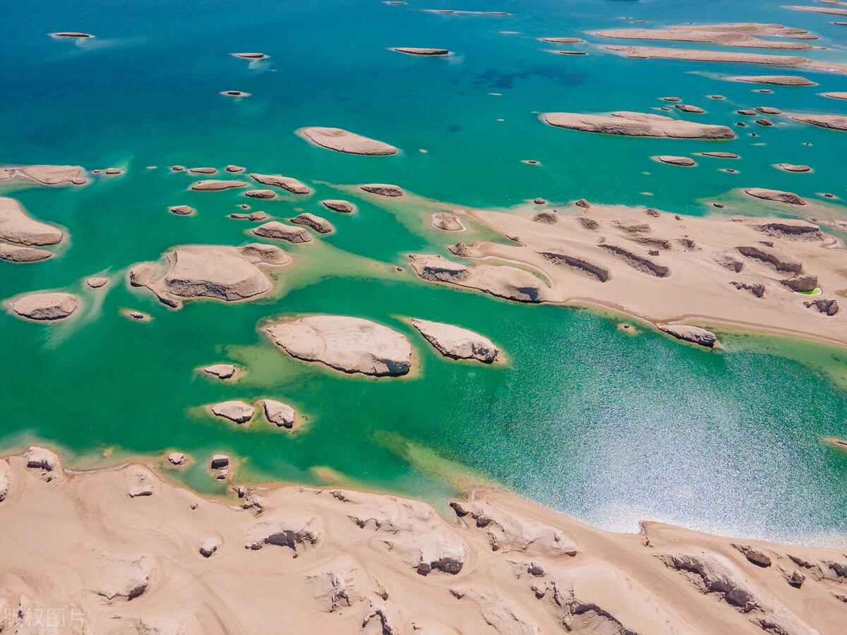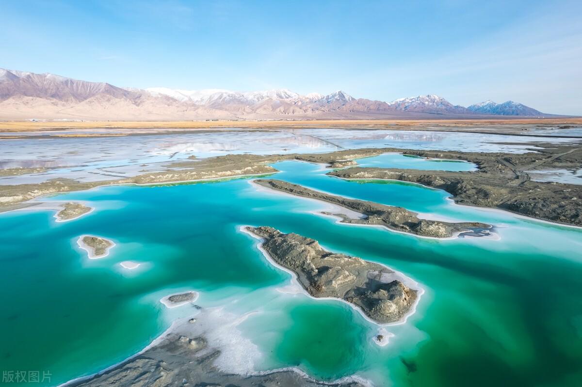 形状各异,色彩丰富的盐池在柴旦湖中四处洒落开来,还真像大珠小珠落玉盘,宛如翡翠。翠绿的湖泊让人觉得舒适宁静,在这拍的照片,都带有些许遗世独立的感觉。