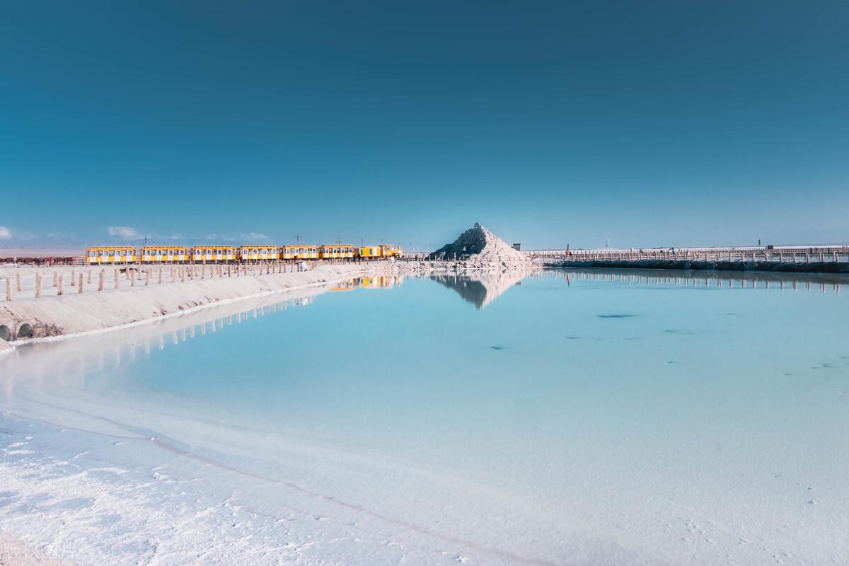 南美的天空之境在玻利维亚,中国的天空之境在这里。茶卡盐湖是固液并存的卤水湖,镶嵌在雪山草地间而非戈壁沙漠上。湖面平静没有一丝水花,如同一面反射天空的镜子。可以乘小火车深入湖中观光,可以透过清盈的湖水,观赏形状各异、正在生长的栩栩如生的朵朵盐花。