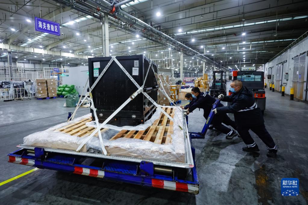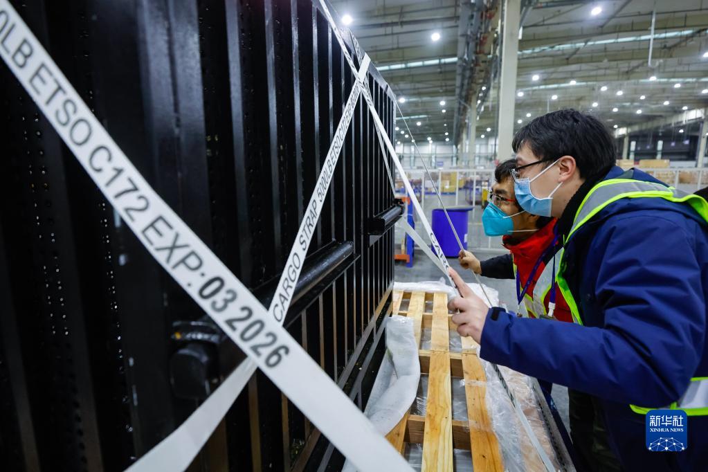 2月21日,在成都双流国际机场,海关工作人员在停机坪监卸大熊猫"香香"。